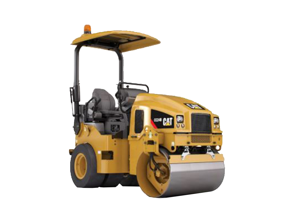 The Caterpillar CC2.6 is a tandem combination roller designed for soil and asphalt compaction. It features a steel drum at the front and four rubber tires at the rear for versatile compaction.
